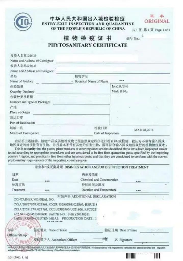 【該批貨物來自注冊加工企業(yè)(注冊號***),符合盧旺達甜葉菊輸華植物檢疫要求議定書要求”】。經(jīng)熏蒸處理的,還應(yīng)在植物檢疫證書中注明熏蒸處理日期、溫度、濃度和持續(xù)時間等處理指標(biāo)。