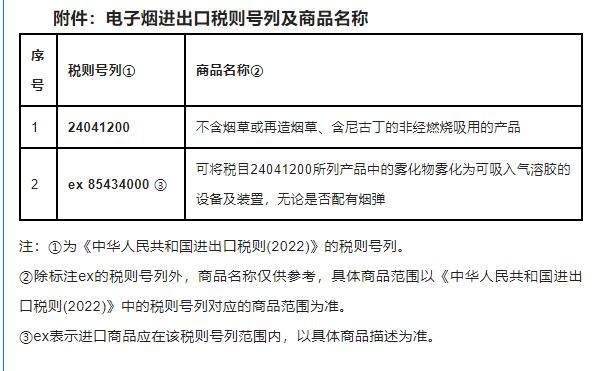 電子煙進(jìn)出口稅則號列及商品名稱見附件。