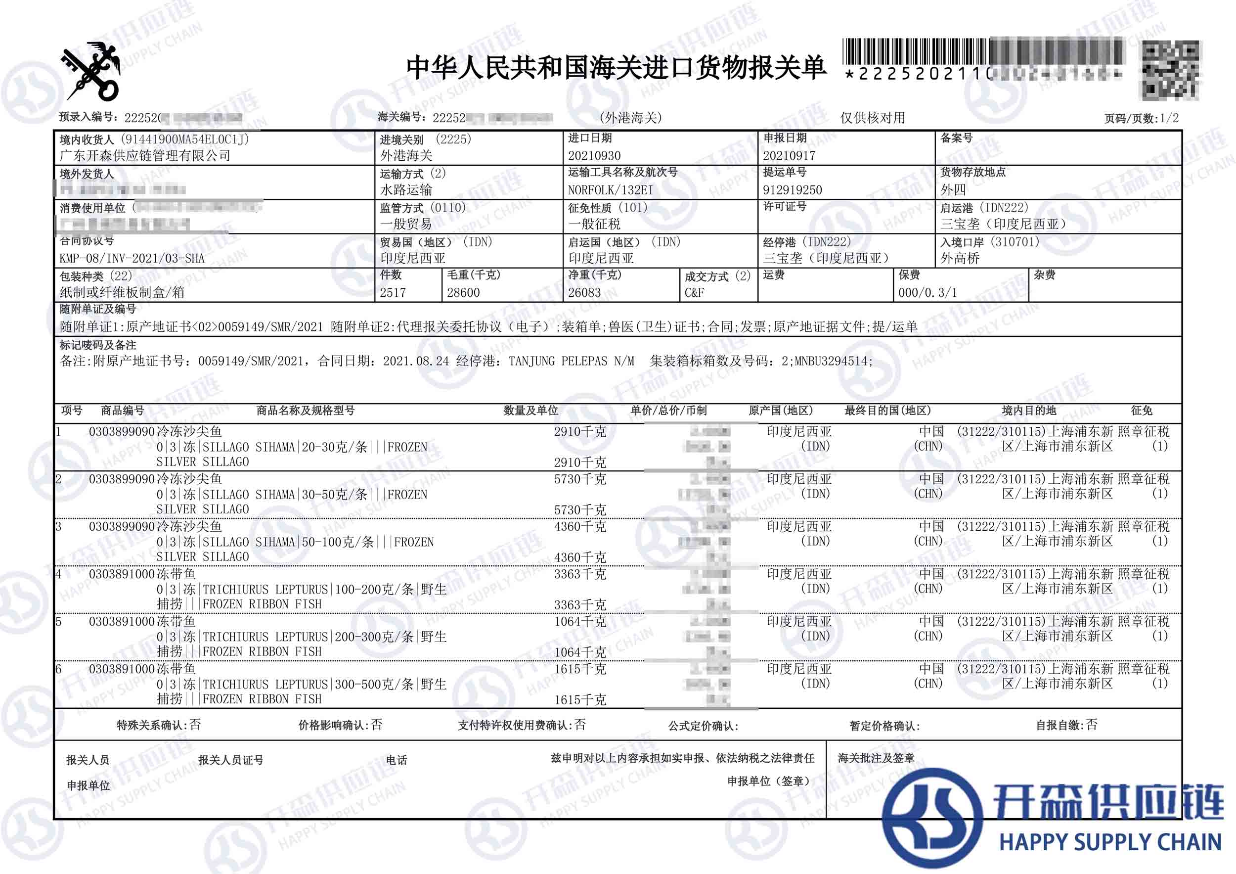 【本文結語】 上述就是印尼凍帶魚進口報關清關代理案例【經典案例】的全部內容,希望能對您有所幫助,如有冷凍海鮮進口報關上任何疑問及問題可隨時在線聯系我們或撥打 18002611553,開森供應鏈擁有豐富的冷凍海鮮進口報關操作經驗及案例,10余年進口經驗為您所用,各類進口疑難都能為您一一解答及協助快速處理解決!