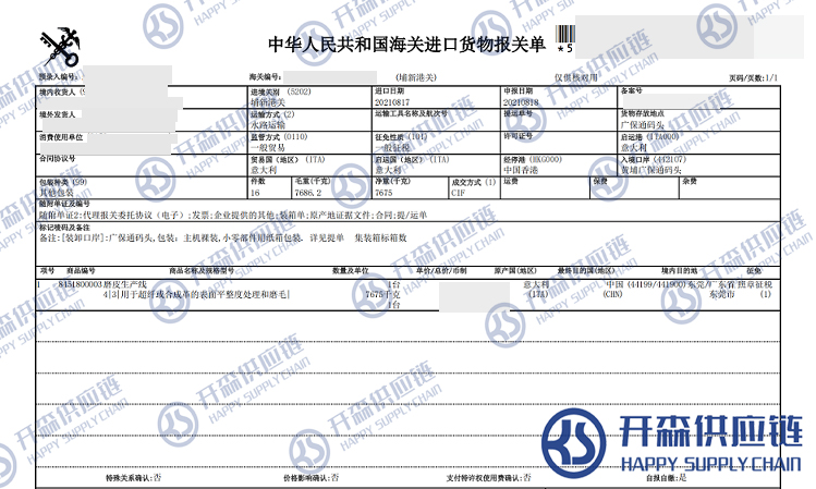 【本文結語】 上述就是意大利磨皮生產(chǎn)線進口報關清關代理服務【經(jīng)典案例】的全部內容,希望能對您有所幫助,如有二手機械進口報關上任何疑問及問題可隨時在線聯(lián)系我們或撥打 18002611553,開森供應鏈擁有豐富的二手機械進口報關操作經(jīng)驗及案例,10余年進口經(jīng)驗為您所用,各類進口疑難都能為您一一解答及協(xié)助快速處理解決!
