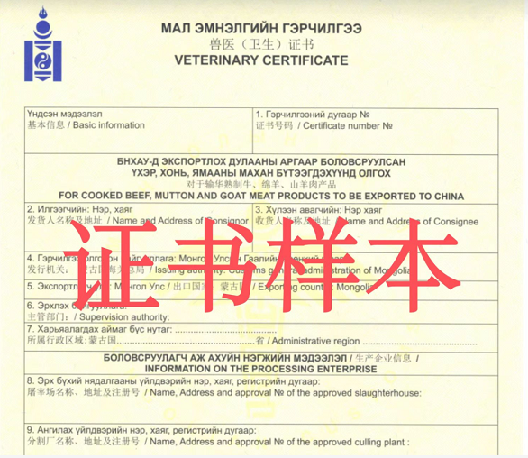 蒙古國官方已向中國海關(guān)總署備案確認(rèn)蒙古國熟制牛羊肉產(chǎn)品獸醫(yī)衛(wèi)生證書樣式、官方印章及官方獸醫(yī)簽字等相關(guān)信息。進口蒙古國熟制牛羊肉產(chǎn)品應(yīng)附有蒙古國官方出具的獸醫(yī)衛(wèi)生證書,并加蓋官方印章和官方獸醫(yī)簽字,同時向中國海關(guān)推送對應(yīng)蒙古國輸華肉類衛(wèi)生證書電子信息。